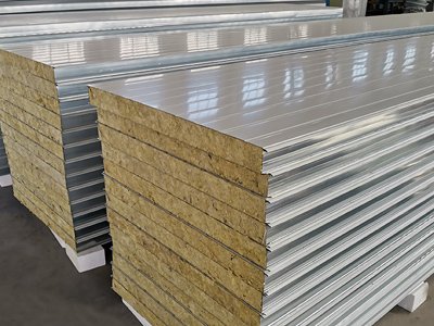 巖棉彩鋼夾芯板其上下表面采用鍍鋅彩色鋼板或鍍鋁鋅彩色鋼板,厚度為0.4-0.8mm。通過自動化連續(xù)成型機,經(jīng)壓型后用高強粘合劑粘合而成。巖棉塊交錯鋪設,其纖維走向垂直于巖棉彩鋼夾芯板的上下表面,并緊密相接充實了巖棉彩鋼瓦的整個縱橫截面。巖棉塊之間和域名與上、下層鋼板之間通過高強度發(fā)泡劑粘接復合而成。巖棉彩鋼瓦有很強的剛度,具有防火、保溫、隔音等性能。