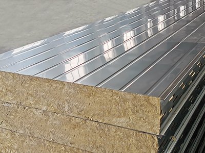 不銹鋼巖棉夾芯板其上下表面采用一面不銹鋼板一面彩鋼板或雙面不銹鋼板,厚度為0.4-0.8mm。通過自動化連續成型機,經壓型后用高強粘合劑粘合而成。巖棉塊交錯鋪設,其纖維走向垂直于不銹鋼巖棉夾芯板的上下表面,并緊密相接充實了不銹鋼夾芯板的整個縱橫截面。巖棉塊之間和巖棉與上、下層鋼板之間通過高強度發泡劑粘接復合而成。不銹鋼巖棉夾芯板板有很強的剛度,具有防火、保溫、隔音等性能。